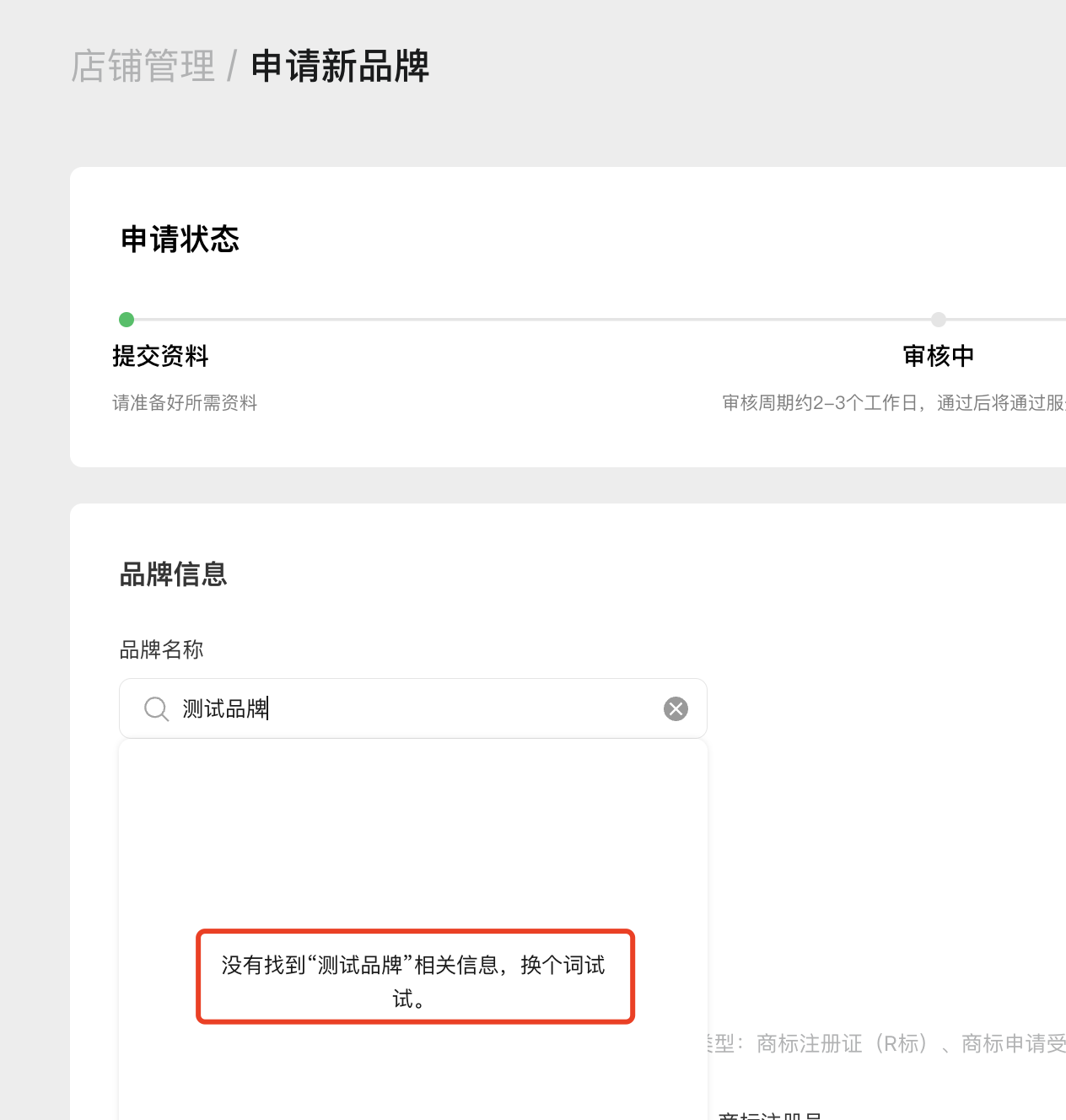 1.1 在【店铺管理—品牌管理—申请品牌】的“品牌名称”处搜索品牌名称,显示未找到相关信息。